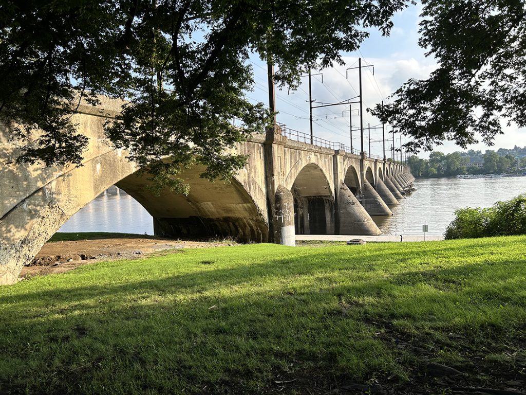 Ci-dessus, la rivière Schuylkill et les Fairmount Water Works : il s’agit du « deuxième des ouvrages hydrauliques de Philadelphie. Conçu en 1812 par Frédéric Graff et achevé à l’origine en 1815, il a fonctionné jusqu’en 1909, remportant des éloges pour sa conception et devenant une attraction touristique populaire ». [Wikipedia]
